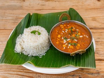 Garbanzos cooked with aromatic indian spices based in a tomato and onion based sauce.