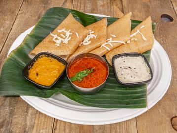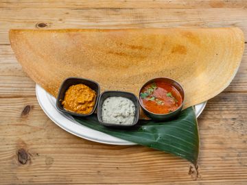 South Indian breakfast dish made from a fermented rice and lentil batter. It consists of a thin, crispy crepe (dosa) that is stuffed with flavorful spiced potato curry.